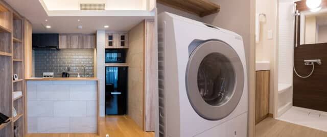 コンパクトなキッチンにはIHクッキングヒーターとシンク、大型の冷蔵庫と電子レンジを備え、カトラリーの貸し出しも行っているので、食材を持ち込んで簡単な料理を作れます。また、大浴場には共用の洗濯機を用意していますが、ファミリーキャビンルームには専用のドラム式洗濯機を備えています。