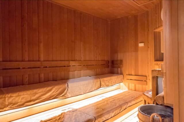男女ともに比較的ゆとりのあるドライサウナを用意。室内にはテレビも備えます。