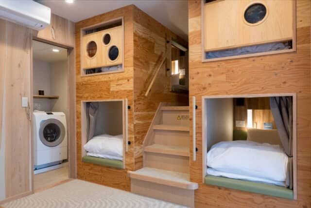 ベッドルームには個室タイプの木製キャビンを2段に置き、それぞれカーテンや照明を備えていて、ちょっとしたワクワク感を楽しめます。家族はもちろんグループ旅行でもプライバシーが守られる設計です。