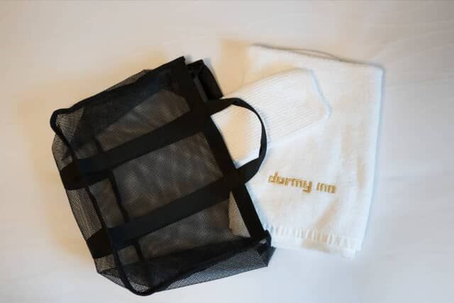 大浴場の利用時に、バスタオルや着替えを入れられる便利なメッシュのバッグ。お風呂を頻繁に利用する方は、フロントで新しいタオルもいただけます。