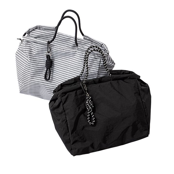 モノクロギンガムを小物で取り入れて、大人のカジュアルに。A4ファイルが楽々入る大容量サイズだから通勤や小旅行にもおすすめ。ハンドルの引き方によってショルダーにもなる2WAYで、その日の気分に合わせた持ち方を楽しめます。チャームは取り外し可能。水加工を施したナイロン素材を使用。小物収納に便利な内ポケットに加え、ペットボトルホルダー、型崩れを防止する底板も内蔵。