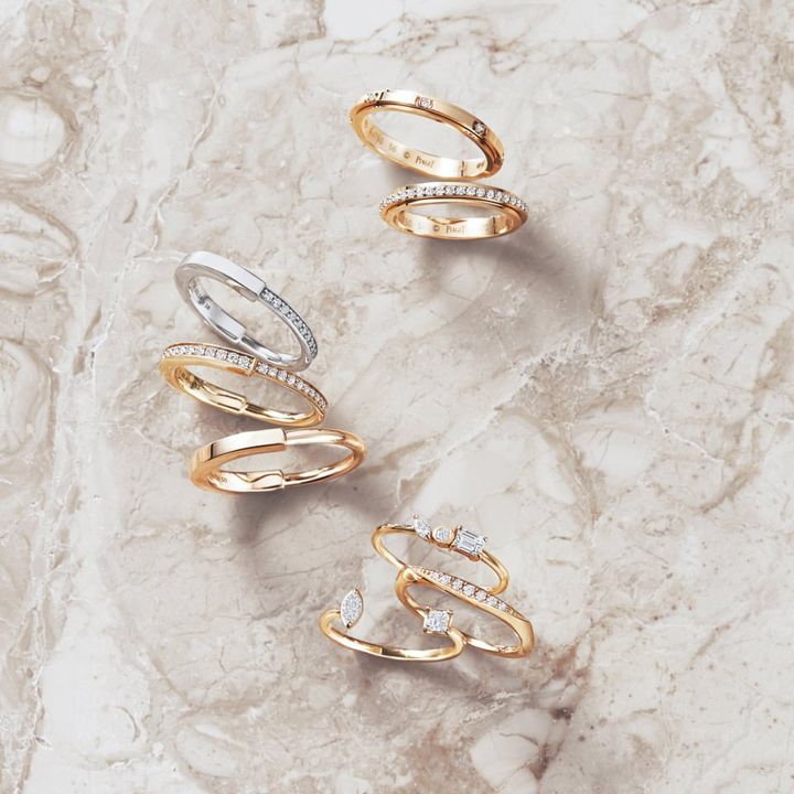 上から:リング〈ポセション〉[PG×DIA]¥301,400、[PG×DIA]¥646, 800※共にサイズによって価格変動あり(共にピアジェ/ピアジェ コンタクトセンター)、リング〈ティファニー ロック〉[WG×DIA]¥577,500、[YG×DIA]¥885,500、[RG]¥203,500(全てティファニー/ティファニー・アンド・カンパニー・ジャパン・インク)、リング〈コネクト〉[YG×DIA]¥132,000、〈レイヤード〉[YG×DIA]¥104,500、〈ピーシーズ〉[YG×DIA]140,800(全てオールニーク)