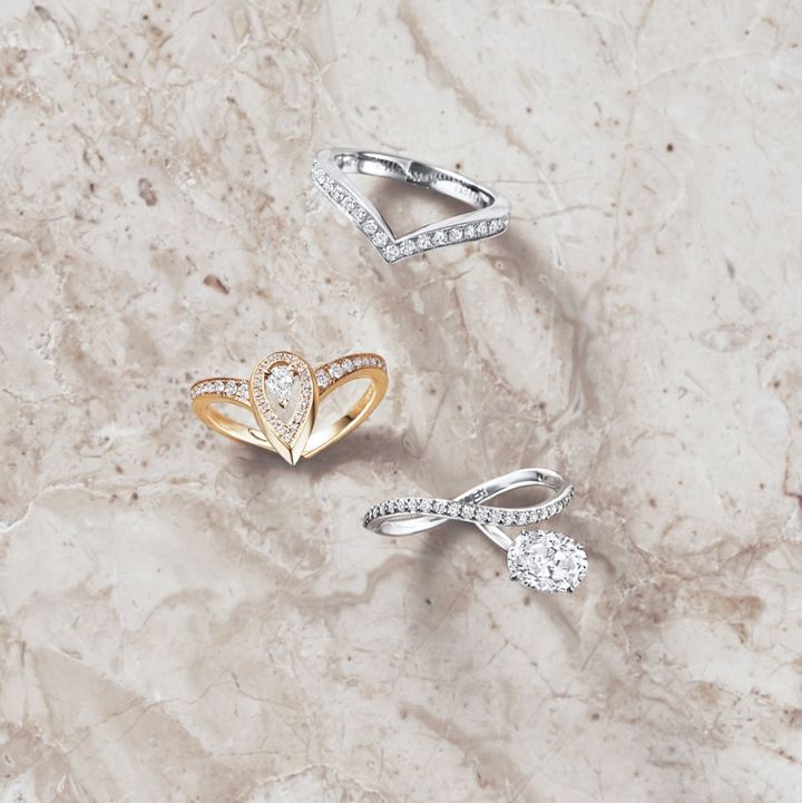 上から:リング〈ペルレ〉[RG]¥407,000(ヴァン クリーフ&アーペル/ヴァン クリーフ&アーペル ル デスク)、リング〈ジョイント〉[YG]¥231,000(トーカティブ/トーカティブ 表参道)、リング〈アイスキューブ〉[WG]¥269,500〜(ショパール/ショパール ジャパン プレス)