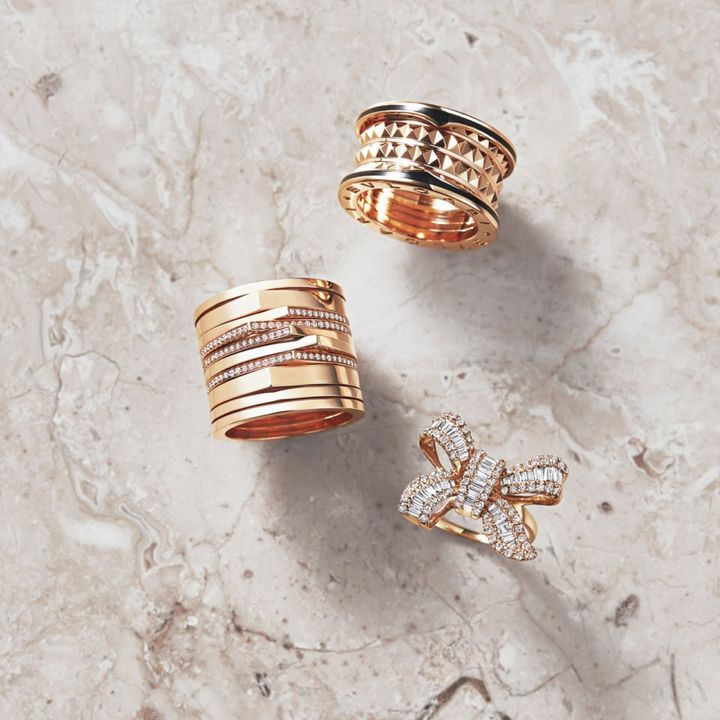 上から:リング〈ビー・ゼロワン ロック〉[PG×ブラックセラミック]¥536,800(ブルガリ/ブルガリ ジャパン)、リング〈アンティフェール〉[PG×DIA]¥2,090,000(レポシ/レポシ日本橋三越本店)、リング[YG×DIA]¥220,000(ピモンテ)