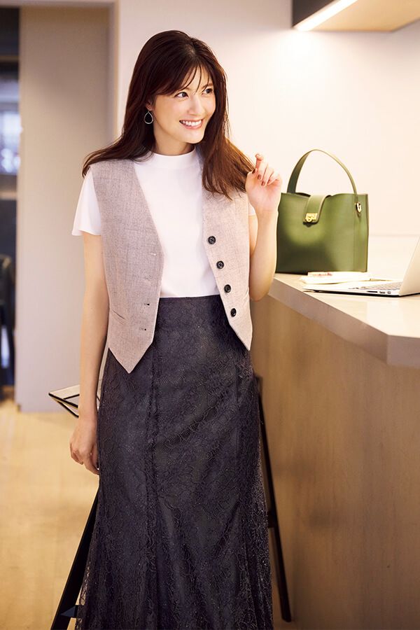 ジレ¥18,700/アプワイザー・リッシェ ブラウス¥4,939/ロペピクニック(ジュンカスタマーセンター) スカート¥14,300/MERCURYDUO イヤリング¥66,000/ケンゴ クマ プラス マユ(ヴァンドームヤマダ) バッグ¥3,848/grove(ワールド プレスインフォメーション)