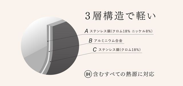 鋳鉄鍋と同様な蓄熱性や温度均一性と軽量化を両立させるために選んだのが、ステンレスでアルミニウムを挟んだ3層構造の材料で、比較した鋳鉄鍋に比べて、同じ容量でも1/2~1/3程度の重量です。また、ガスだけでなくIHにも対応しています。