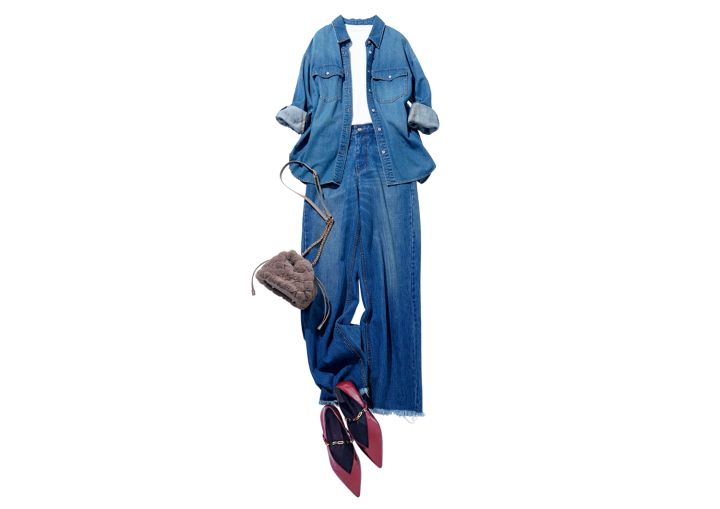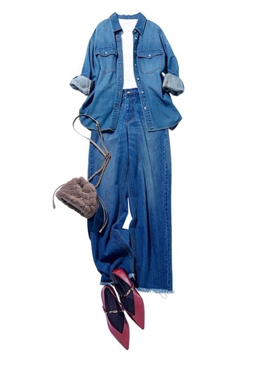 バックプリントTシャツ¥17,050/ザ インターナショナル アート コレクション デニムシャツ¥18,700/アルページュストーリー デニムパンツ¥20,900/リエル リシェ チェーン付きパンプス¥30,800/銀座かねまつ(銀座かねまつ6丁目本店) ファーバッグ¥13,200/ノエラ