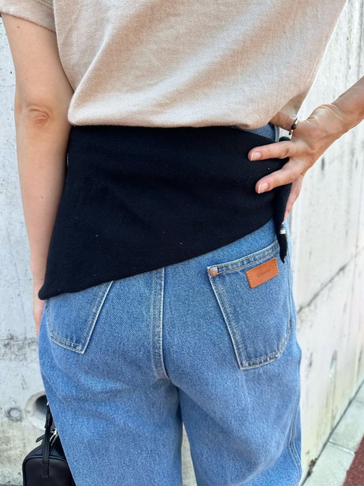 「ハイウエストなシルエットで形がとてもキレイ! このデニムをはくといつもより小尻に見せてくれるのも好きです(笑)。ストールは腰巻きにしても可愛い」クリスタセヤのデニム、エクストリームカシミヤのストールは共に本人私物