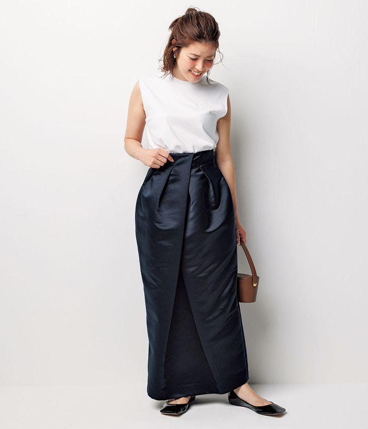 キレイめ艶スカートと一緒にTシャツもリッチに刷新