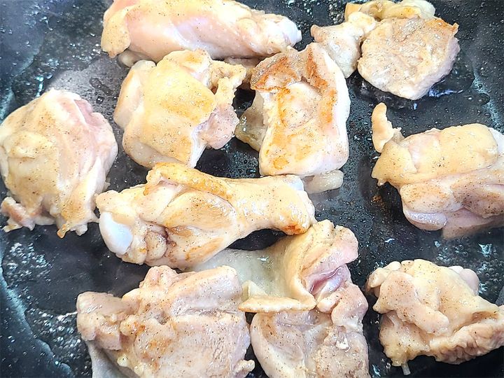 3. フライパンに油を引き強火で熱し、2の鶏肉を皮目から焼きます。両面焼き、余分な脂はキッチンペーパーなどで拭き取ります。