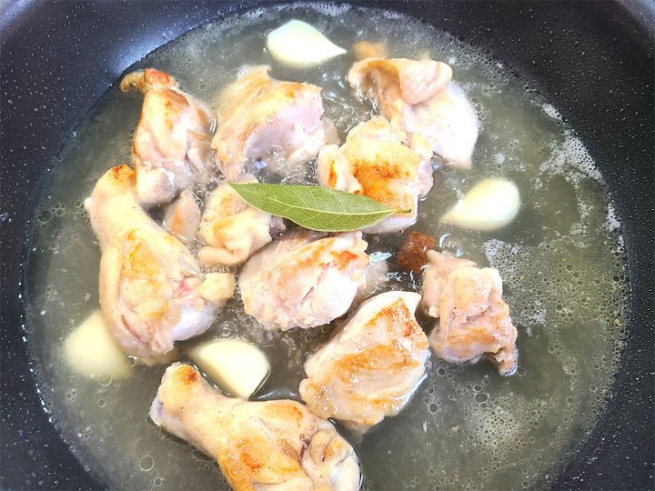 4. 白ワインと水300ml(分量外)を入れ、沸騰したらアクを取り、コンソメ、皮をむいたにんにく1株と1/2株、ローリエ、タイムを入れフタをして弱火で30分ほど煮込みます。
