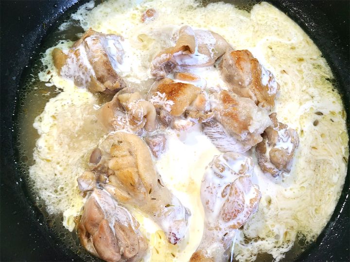 6. 5に生クリームを入れふつふつとしてきたら火を止め、塩、こしょうで味を調えます。