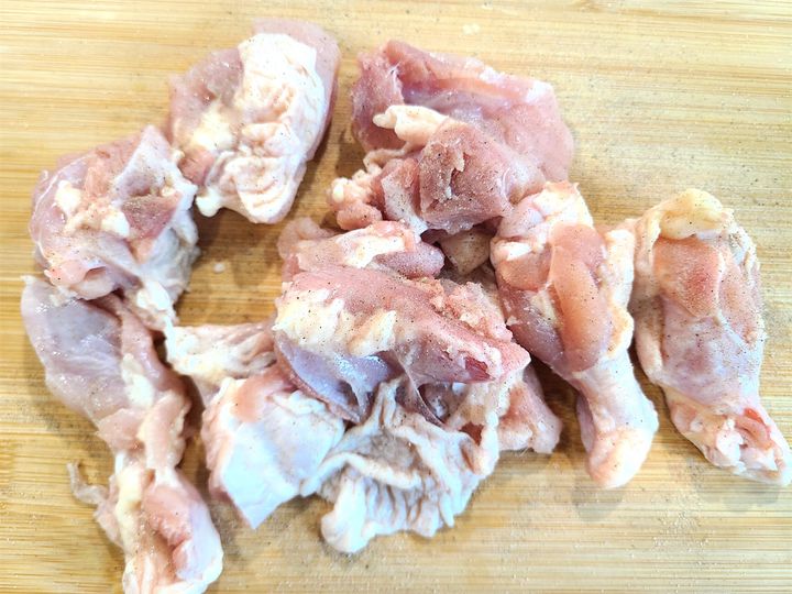 2. 鶏もも肉はひと口大にカットし、鶏手羽元と一緒に両面に塩、こしょうを強めにします。
