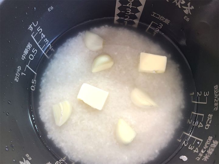 1. 炊飯器に米、皮をむいた[にんにくご飯]のにんにく5かけ、バターを入れて炊きます。水加減は2合分に合わせてOKです!炊き上がったらにんにくをつぶして全体を混ぜます。