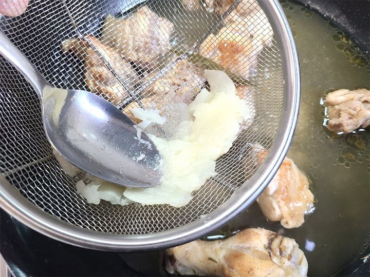 5. 4のにんにくを取り出しザルなどでつぶし、フライパンに戻します。その間も弱火で加熱は続けます。