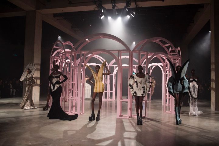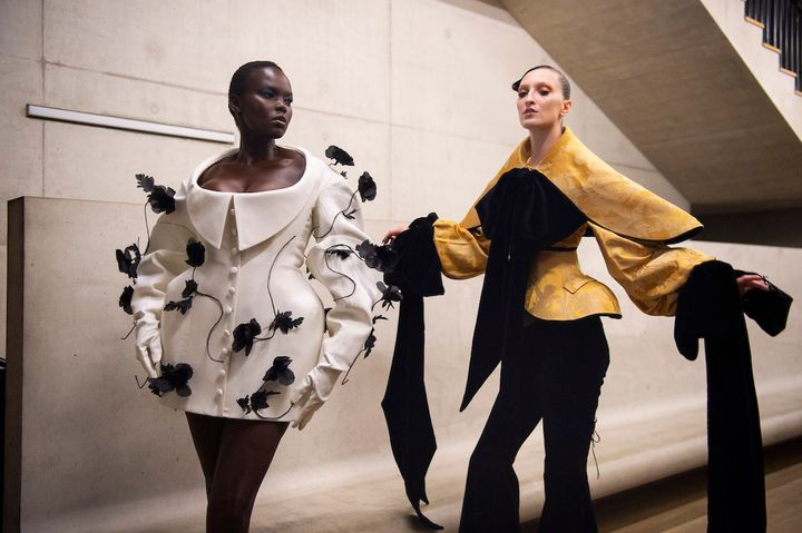 今季の着想源は英国・ロンドンのファッション史。「ロンドンでブランドをはじめて4年目。これまでにも影響を受けてきた王室や貴族のスタイル、かつてのヴィヴィアン・ウエストウッドジョン・ガリアーノアレキサンダー・マックイーンたちの構築的でダイナミックなファッションにフォーカスを当てたいと思った」とハリスは話す。コルセットやエリザベスカラー、クリノリンといった中世のドレスを彷彿とさせるディテールをふんだんに取り入れてデフォルメし、ブランドらしい強弱のあるシルエットでドラマチックに落とし込んだ。