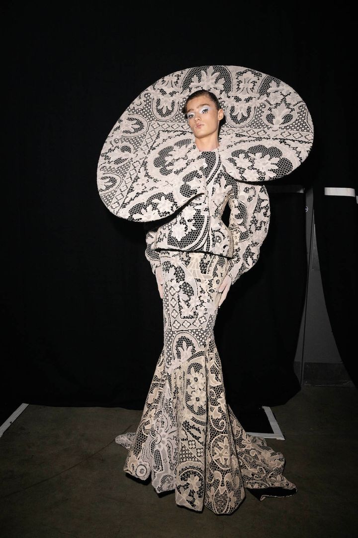 新鮮なのは、インテリア生地をアップサイクルした素材使い。ブランドなりのサステナビリティへの取り組みとして、先シーズンから強化している部分だ。ヴィンテージのヴェネツィアンレースのテーブルクロスは、大きな円形の襟が目を引くマーメイドドレスにあしらい、19世紀のフランス製のレースカーテンはクリノリンに貼り付けてシースルーのケージドレスに生まれ変わらせた。