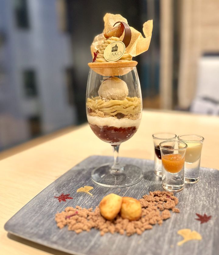 上品な栗の味わいを堪能しながら食べすすめ、途中で「みたらしソース」の甘じょっぱさや他のソースで味変し、最後はりんごのほどよい甘さを感じる和紅茶ジュレでさっぱりと。一度で何通りも楽しめる、至福のパフェです。