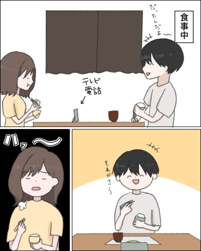 家で食事をしていたカナコさんとユウタさん、カナコさんは終始無言で食べているのに対して「・・だったんだよ~。それでさ・・」と楽しそうに笑いながら食事をしているユウタさん、なんと、話している相手はカナコさんではなく義母でした。呆れた状況にため息をついたカナコさん、すると食後に「さっきため息をついたよね?母さんに聞こえたじゃん」不満そうな口調でユウタさんが言いました。「・・・」返す言葉もなくカナコさんが黙っていると「カナコが『食事中に席を外すな』って言ったからこうなってるんだよ」今のこの状況はカナコさんのせいだと言わんばかりの口調でユウタさんが突っかかってきました。