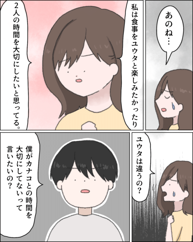 義母とスマホで話しながら食事しているユウタさんを見てカナコさんがため息をつくと、「カナコが『食事中に席を外すな』って言ったからこうなってるんだよ」今のこの状況はカナコさんのせいだと言わんばかりの口調で言うユウタさん、「あのね・・私は食事をユウタと楽しみたかったり、2人の時間を大切にしたいと思ってる。ユウタは違うの?」カナコさんがユウタさんにたずねると「僕がカナコとの時間を大切にしてないって言いたいの?」ユウタさんが答えました。
