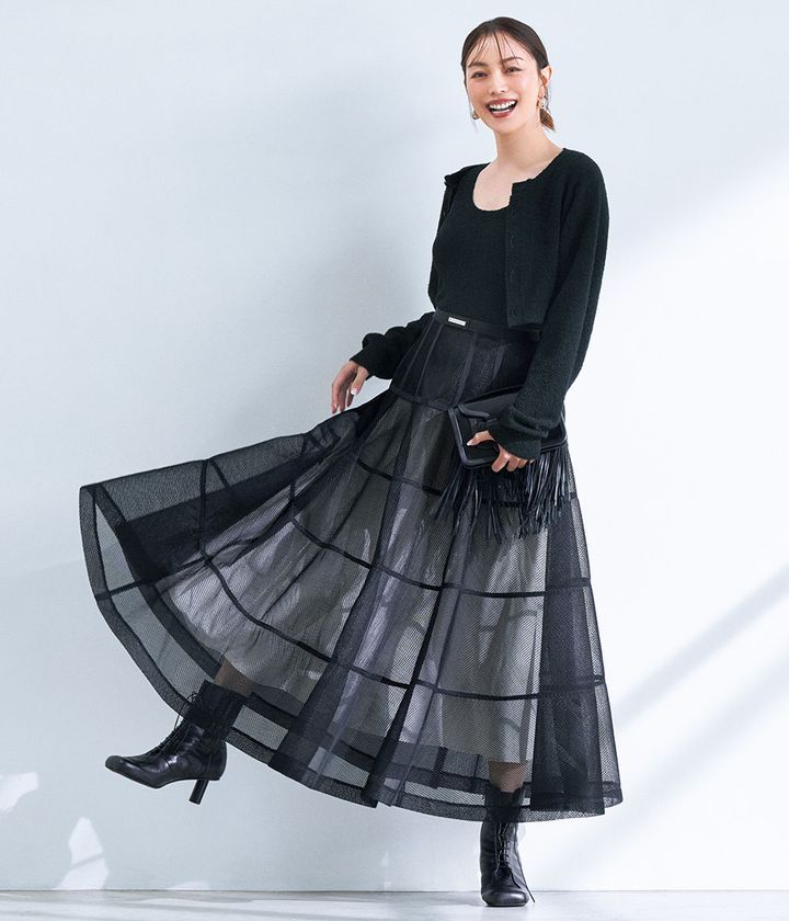スカート¥29,700(プランクプロジェクト/プランクプロジェクト 青山店)カーディガン¥24,200タンクトップ¥18,700(ともにロエフ/エイチ ビューティー&ユース)バッグ¥172,700(ピエール アルディ/ピエール アルディ 東京)ブーツ¥75,900(アキラナカ/ハルミ ショールーム)ピアス¥19,800(ニナ・エ・ジュール/ショールーム ロイト)