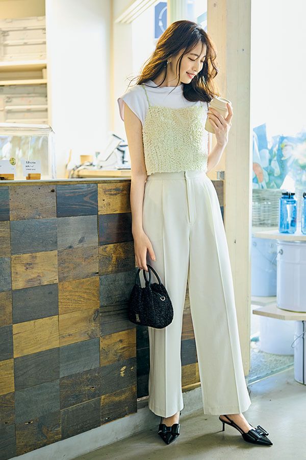 Tシャツ×キャミソールのカジュアル合わせも、同系色のパンツを合わせれば大人な表情に。小物は黒でまとめてホワイトコーデを引き締めて。