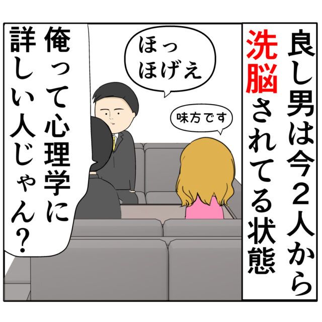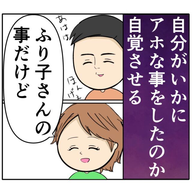 夫の良し男さんがふり子さんと会っている証拠を掴み2人の関係を問い詰めていると、突然「すみれはモラハラなんです」と言われキレそうになるすみれさん。恐縮しながらもすみれさんはモラハラだと訴え続ける良し男さんに怒りを募らせながらも、すみれさんは冷静にこの状況を分析。「ふり子さんに言われたの?私がモラハラだって」と良し男さんに尋ねます。それを聞いて動揺する良し男さん。すみれさんはふり子さんとの関係を説明してと良し男さんに言いました。すると、急に「モラハラの話、後回しにしたらいけない気がする。今日ふり子さんと一緒に来た心理学に詳しい友達も」と良し男さんが突然堂々と話し始めました。これを聞いてすみれさんは、不倫せずに家庭を壊して良し男さんを手に入れることがふり子さんの真の狙いだと気づいたのでした。