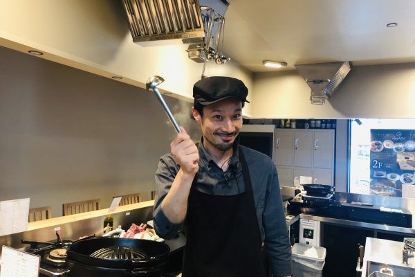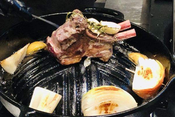 「Lambでしょ名物大草原焼き〜香ばしひつじ肉の四種盛り〜」はラムチョップをはじめお肉と野菜をカウンターの目の前で焼いてもらえるのですが、鍋底に流れたお肉の油をオリーブオイルと合わせて野菜や肉にかけながらじっくり焼いていきます。お肉が焼けるのを待ちながら、野菜ソテーをつまみにお酒を飲むのも贅沢な時間です。
