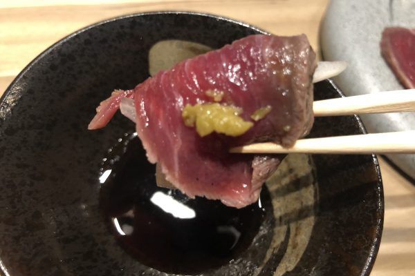 最初は「羊肉の赤身肉たたき」。添え付けの玉ねぎスライスを乗せて巻き込み柚子胡椒やポン酢をつけて食べます。一口で食べるととても柔らかく、クセや臭みも全くなく美味しい!