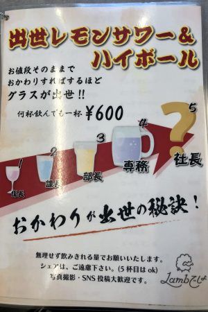 レモンサワーとハイボールは何杯飲んでも一杯600円。しかもおかわりのたびにグラスが大きくなっていくというユニークなメニューもあります。