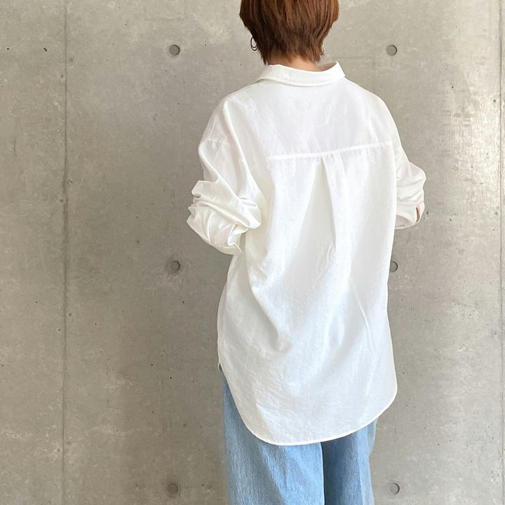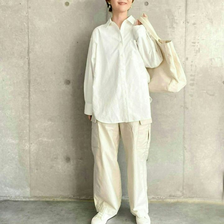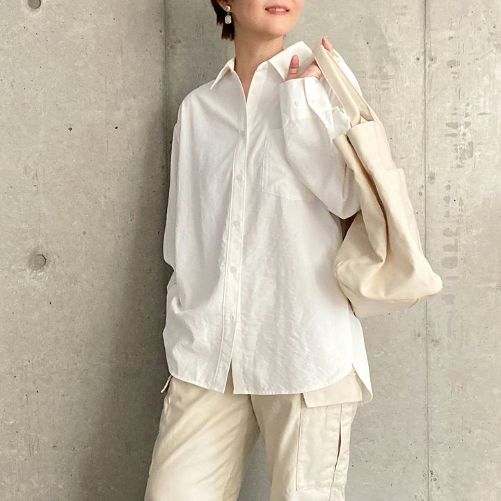 真っ白過ぎないので秋カラーのアイテムとも合わせやすそう。オールホワイトもおすすめ!オーバーサイズのシルエットがきれいで誰でもおしゃれに見えるシャツです。