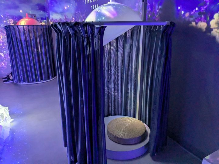 このおこもり感満載のブースでシャンプー、トリートメント、ヘアパックの香りが体験できました。ヘッドホンをつけて心地よい音楽と共に、天井には誘導瞑想のような画像が展開されていました。