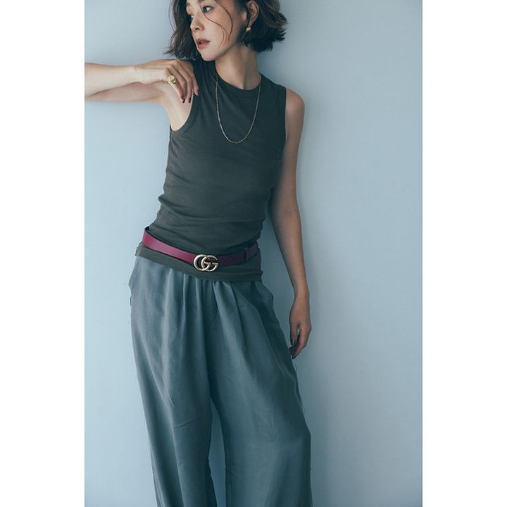ベルト¥68,200(グッチ/グッチ クライアントサービス)カーキタンクトップ¥7,700(ネイヴ/オンワード樫山)グレーパンツ¥25,300(エトレトウキョウ)ピアス¥39,600(ブランイリス/ブランイリス トーキョー)ネックレス¥116,600(ココシュニック)リング¥34,100(リューク)