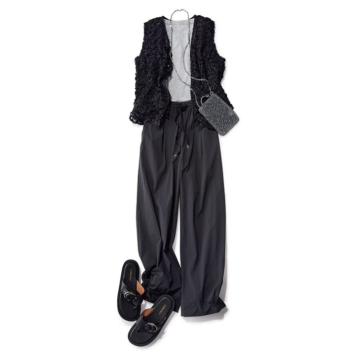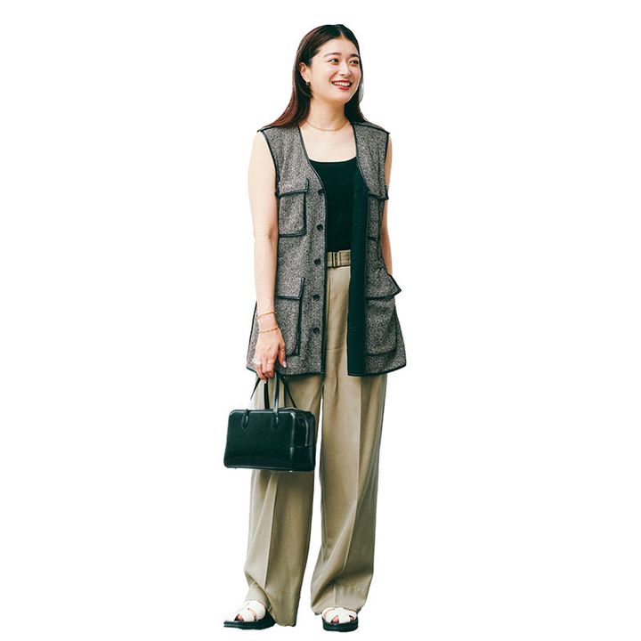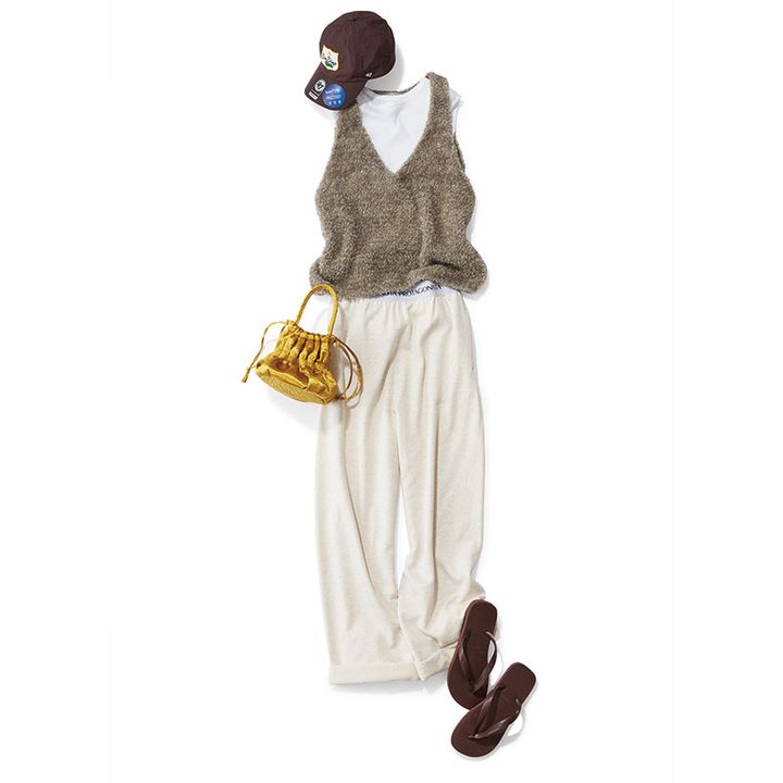ニットベスト[8月中旬展開予定]¥28,600(オブリオ)タンクトップ¥9,900(ピルグリム サーフ+サプライ)サンダル¥2,800(ハワイアナス/ハワイアナスジャパン)パンツ¥27,500(プロタゴニスタ/フレームワーク ルミネ新宿店)キャップ¥4,950(フォーティーセブン)バッグ¥9,900(サロン アダム エ ロペ)