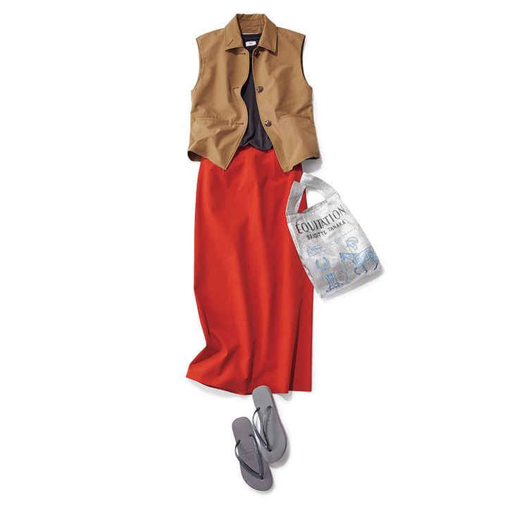 適度にハリのある衿つきジレは、シャツ以上ジャケット未満のきちんと感が魅力。カラースカートも知的な印象に。キレイめなボトムスと合わせたらお仕事シーンでも活躍間違いなし。