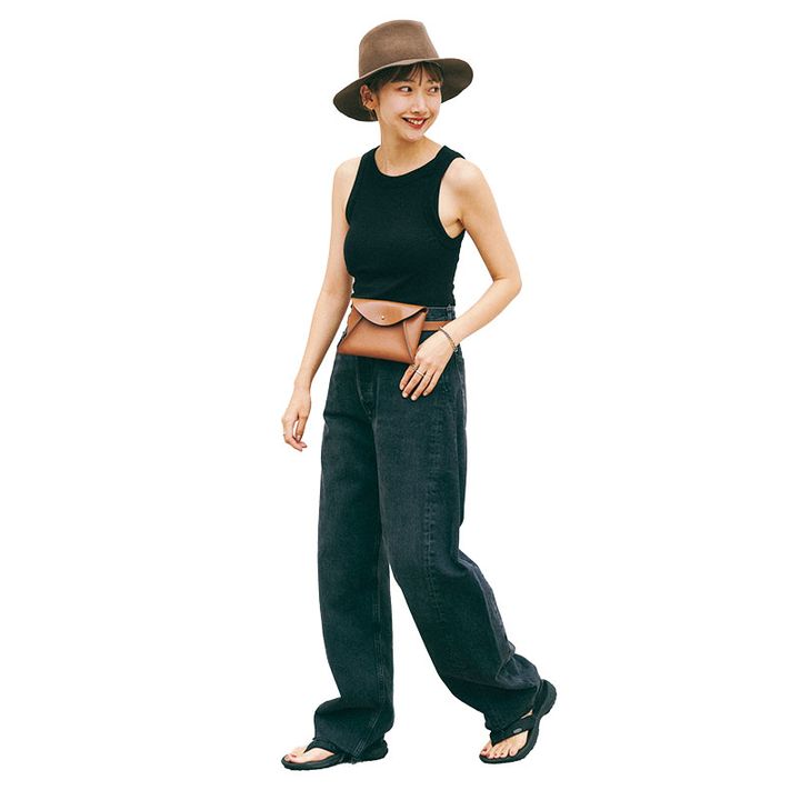 今年気になっているブラウンはこの時季季節の先取りにも。ALBERTUS SWA NEPOELのウールフェルトハットやマニュエラのベルトバッグで素材感もプラスし、秋らしいムードに。茶系小物はその他のコーデを黒ワントーンにするのがポイント。LA madeのタンクとKEENのサンダルで程よく肌見せや、AGOLDEのヴィンテージ風デニムで抜け感を。