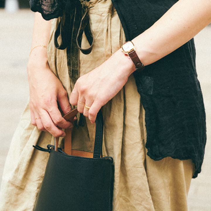 ゴールドバックルもスクエアならガチャベルト感覚でエレガントになりすぎず、使いやすい。黒トップスに馴染ませれば、ベルト初心者もトライできるはず。