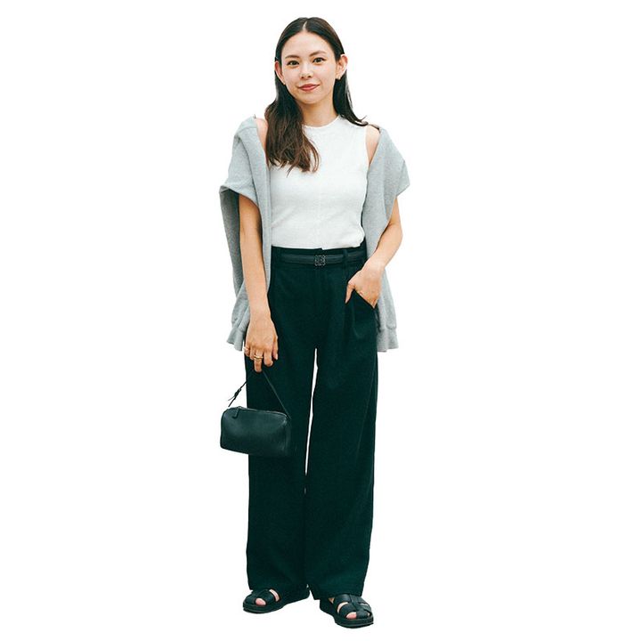 晩夏は小物を黒レザーでまとめることで真夏感を脱するよう意識。LOEWEのベルトはつけるだけでコーデが締まる名品! THE ROWのバッグとサンダルで統一感を出します。ナインアールのアメスリタンクはベーシックな形で着回し力抜群。Gajessのスウェットはエアコン対策にもあると便利です。