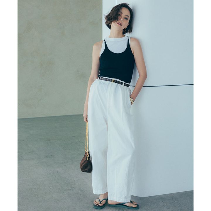 モノグラム・パターンは主張しすぎない細めを選ぶのがポイント。白タンクにニットキャミを重ね、ワイドパンツに合わせたカジュアルコーデも即リッチアップ。