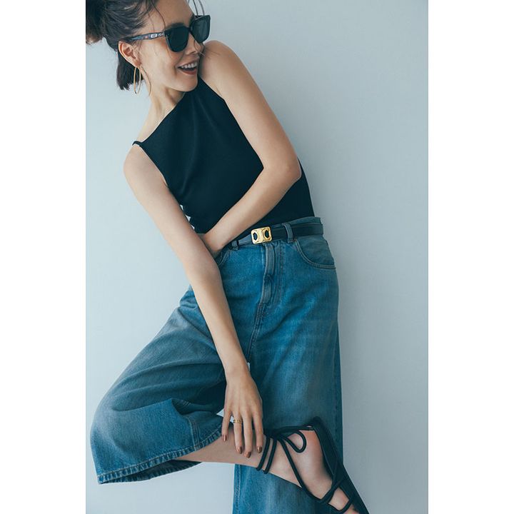 ベルト¥104,500[予定価格](セリーヌ バイ エディ・スリマン/セリーヌ ジャパン)黒ニットタンクトップ¥6,600(マウジー/バロックジャパンリミテッド)サンダル¥10,900(チャールズ&キース/チャールズ&キース ジャパン)デニムハーフパンツ¥41,800(ハイクレ/ショールーム ロイト)サングラス¥31,300(ジェントルモンスター/エム)ピアス¥66,000(モニス/フォーティーン ショールーム)ローマ数字リング¥118,800(ジジ/ホワイトオフィス)