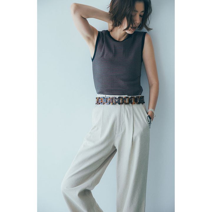 ヘルシー感のある細ボーダーのタンクトップには、女っぷりの足せるアクセサリー感覚のベルトがベストマッチ。茶系トーンで揃えるのも今っぽい。