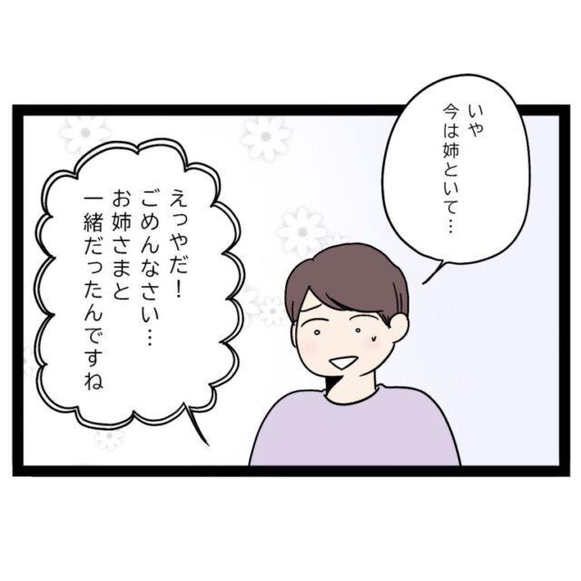 まさひでさんが「今は姉といて・・・」と困りつつも答えると、今度は「えっやだ!ごめんなさい。お姉さまと一緒だったんですね」と申し訳なさそうに言いました。