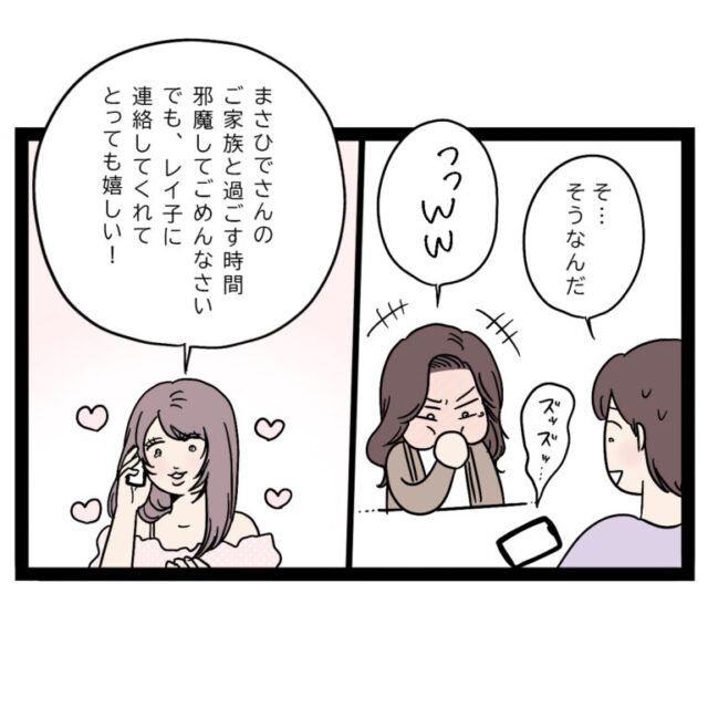 レイ子さんは「ご家族と過ごす時間、邪魔してごめんなさい。でもレイ子に連絡してくれてとっても嬉しい!」とまさひでさんに甘えています。