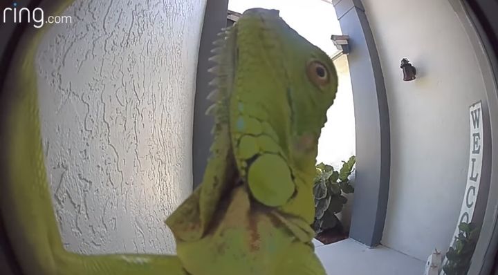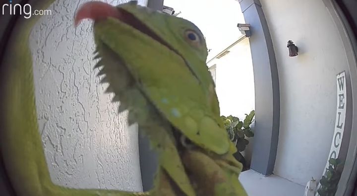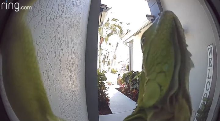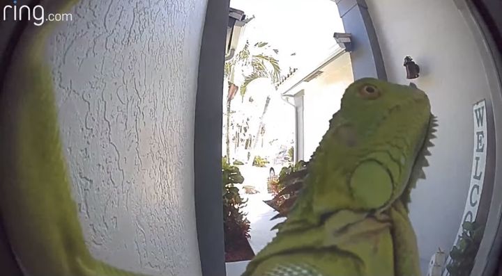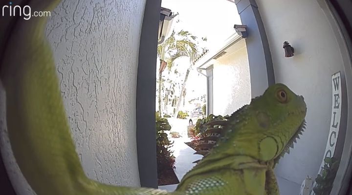 玄関のセキュリティカメラの前にやって来たのは、なんと緑色の巨大なイグアナ! 珍しいお客さんの姿や行動は、こちらの動画でご覧いただけます。