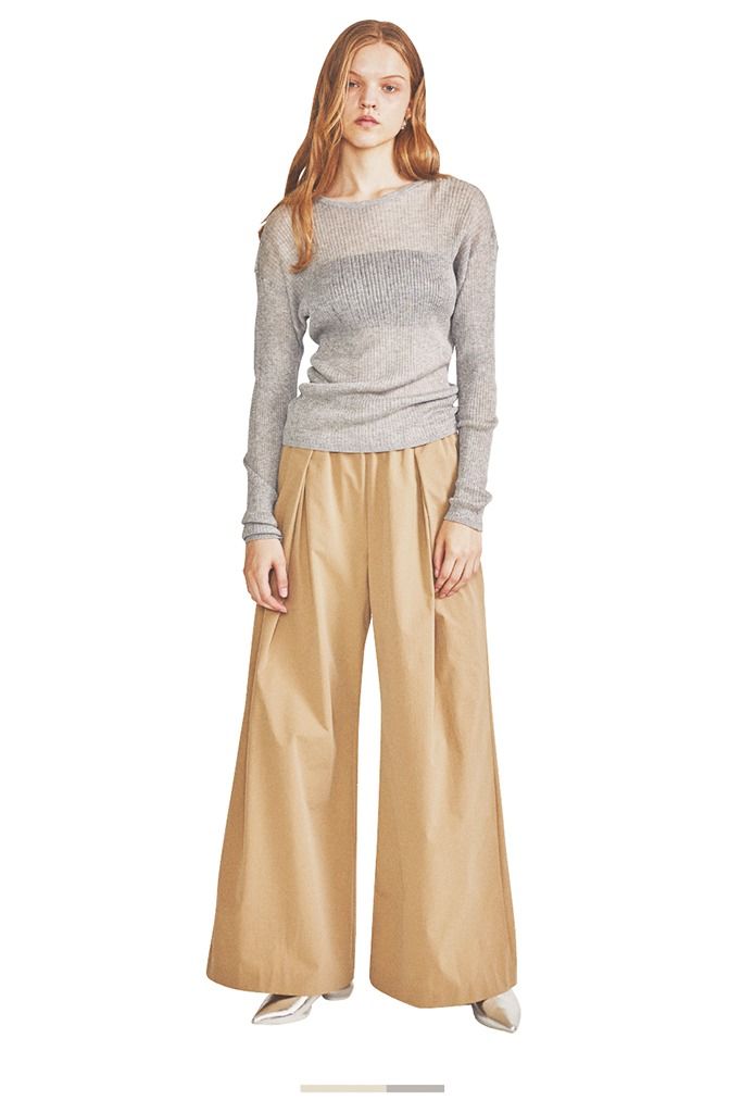 タックのおかげで色にぼやかされずキレイを促す美形なパンツが、シアーなグレーの立役者に。全体をAラインのシルエットでまとめると、バランスよく。パンプスもグレーに似たシルバーにすることで統一感を漂わせられる。