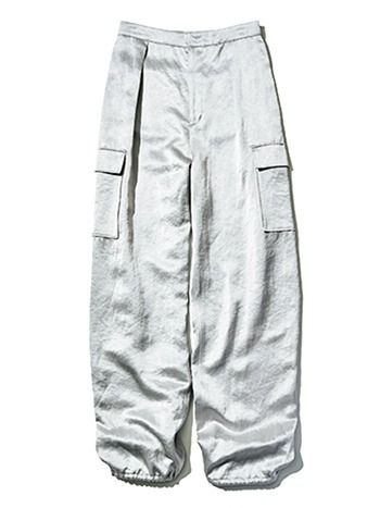 ライトグレーカーゴパンツ/アルアバイル どう着ても上品なサテンで、旬なカーゴをドレスアップ。すそのドロストでストレートにもテーパードにも変化。