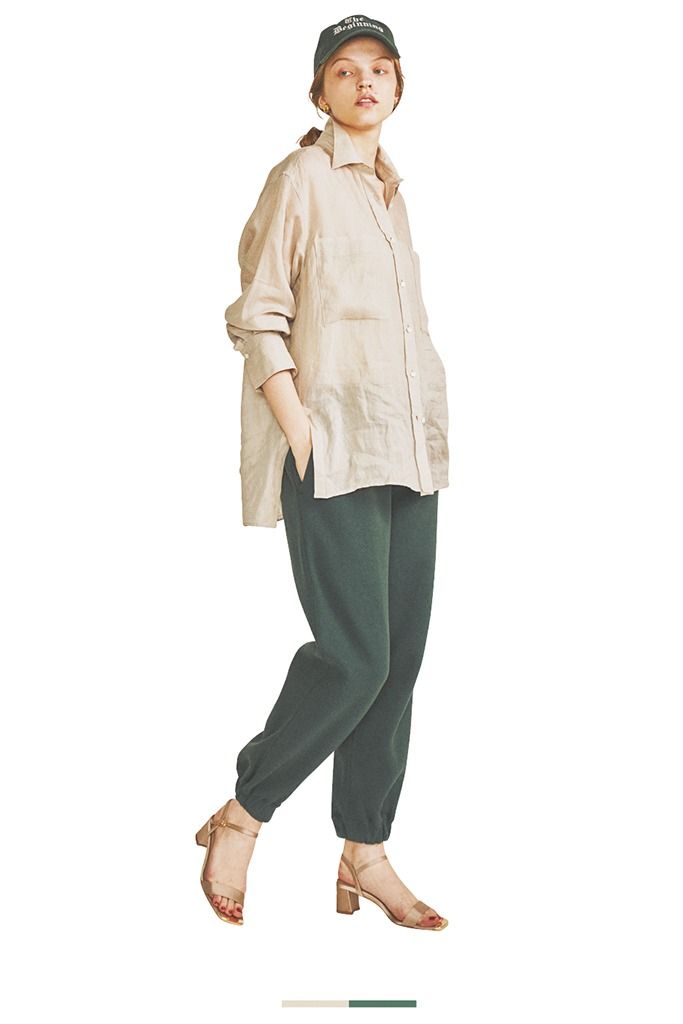キャップとスエット、さらにダークグリーンのタフなイメージを、落ち感のあるやわらかな素材のベージュシャツでマイルドに調節。肌なじみのよいベージュと合わせると女性らしい雰囲気に落としこみが可能。