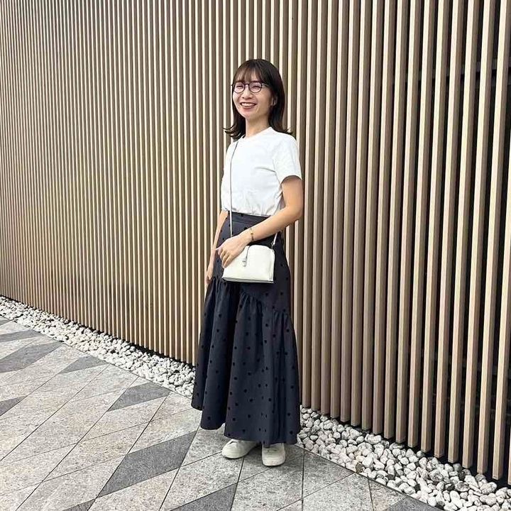 まだまだ暑い日が続くので、UNIQLO(ユニクロ)の半袖Tシャツとあわせてスタイリング。ナチュラル ビューティー ベーシックから毎シーズン登場する定番アイテム「ライトウォレットショルダーバッグ」のホワイト、以前に紹介したDIANA(ダイアナ)の白スニーカーをあわせました。スカート以外のアイテムを白で統一することで、スカートが主役のコーディネートになります!