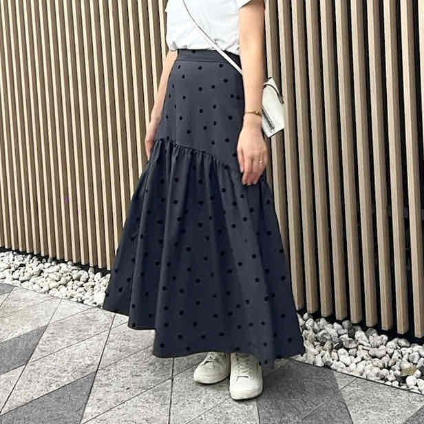 ドット柄のロングスカートと思うと主張が大きそうですが、腰回りはすっきりしていてトップスをインしても、スウェットなどゆるめのトップスをアウトしてもバランスよく着られます。また、チャコールグレーはとても落ち着いたカラーなので、ベーシックカラーはもちろん、パープルなどこっくりしたカラーとあわせても上手くまとまると思います。