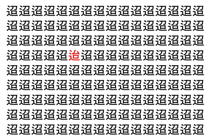 画像の中には、「迢」という漢字が縦に9行、横に16個並んでいます。 全部で144個となりますが・・・、そのうち1つは「異なる漢字」となってますよ!!